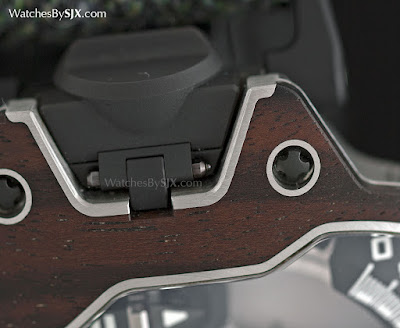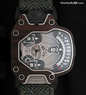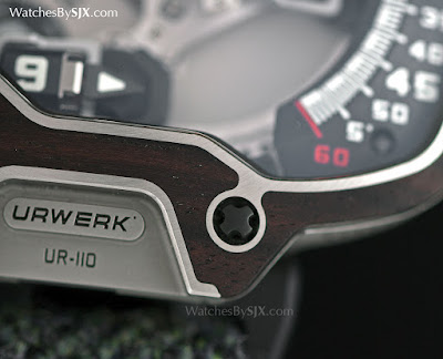 Bestimmte Wälder können fast so hart wie Metall sein, was sie außergewöhnlich schwer zu bearbeiten macht. Historisch gesehen hat die Werkheit von Urwerk außergewöhnlich komplexe Fallformen (die 103 , 201 und das Opus V waren bahnbrechend in ihrer Zeit) in Metall, eine Fertigkeit, die jetzt auf Holz zum ersten Mal angewendet wurde. Anstelle von Urwerk der konventionelle Stahl oder Platin ist die Frontplatte des UR-110 Eastwood aus hartem Holz, entweder Macassar Ebenholz oder rotem Ebenholz.