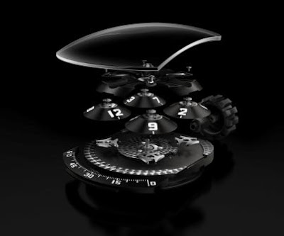 Die Satelliten, die jeweils 3 Zahlen tragen, führen alle 4 Stunden eine vollständige Umdrehung des Zifferblatts durch und drehen sich in dieser Zeit viermal um 120 °, um 480 ° um ihre eigene Achse zu drehen. Jede Stundenzahl zeigt die Zeit an, während sie langsam über die Minutenspur vorrückt.